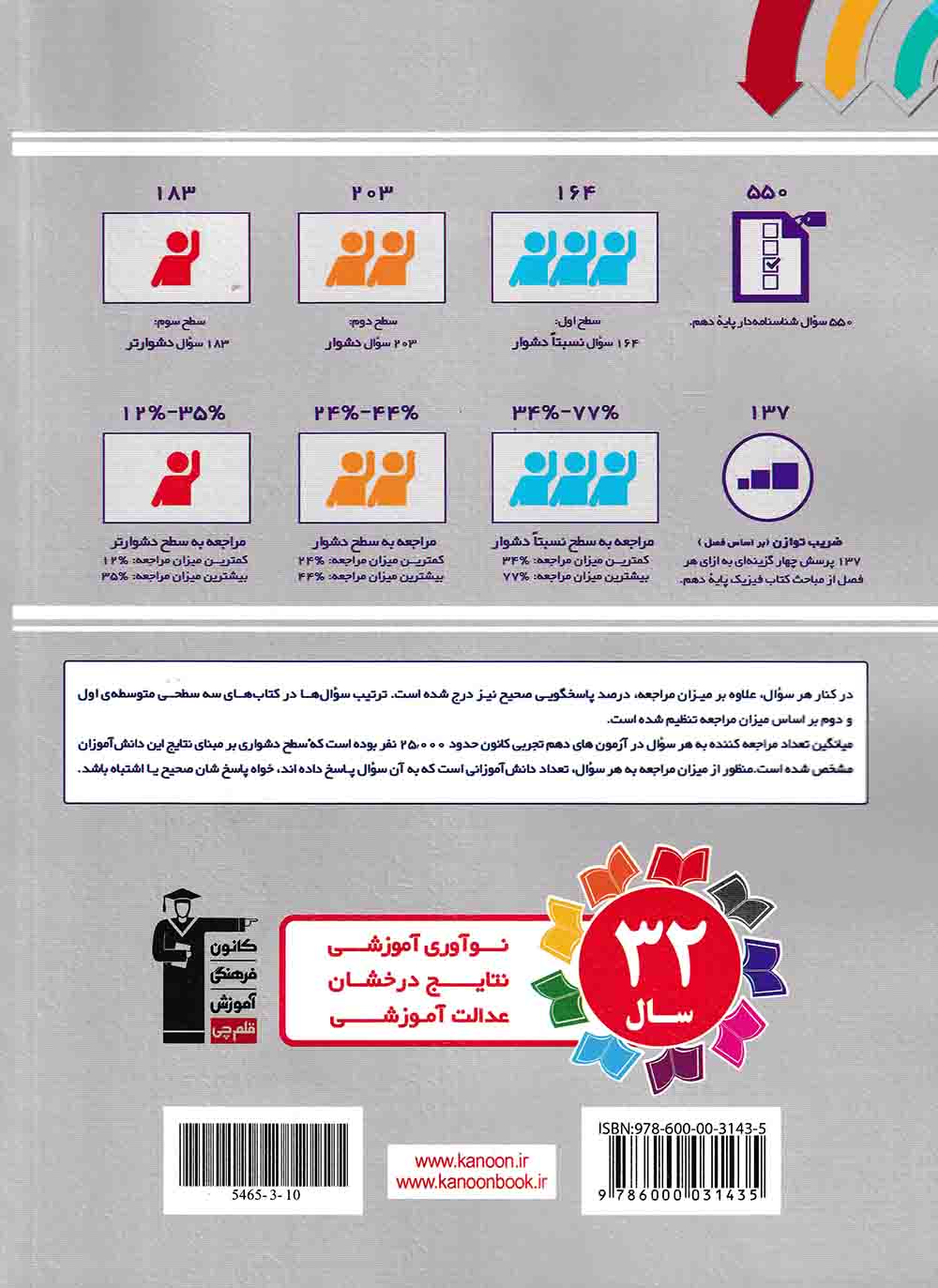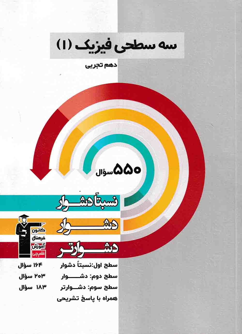 نخست، این که سؤالها، در سه سطح تنظیم شدهاند: سؤالهای نسبتاً دشوار، دشوار و دشوارتر. بنابراین نیمی از دانشآموزان، مخاطب این کتاب هستند یعنی دانشآموزانی با نمرهی بین 14 تا 20 در مدرسه و با ترازهای بیش از 5000 در آزمونهای کانون.